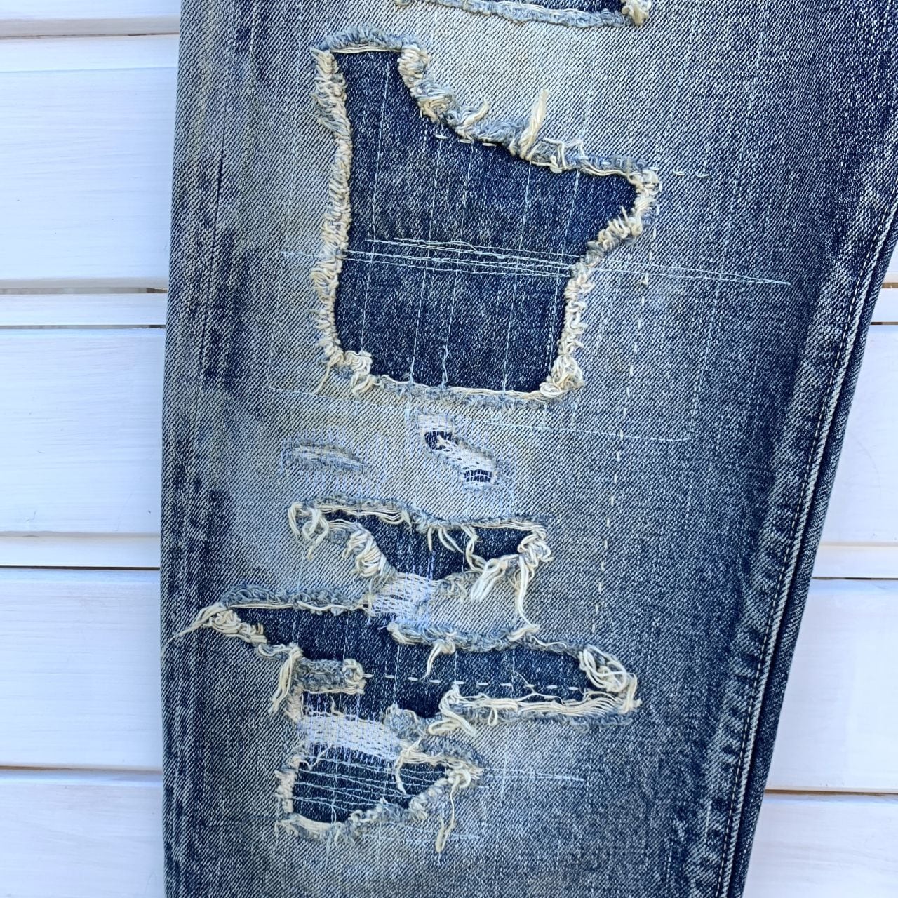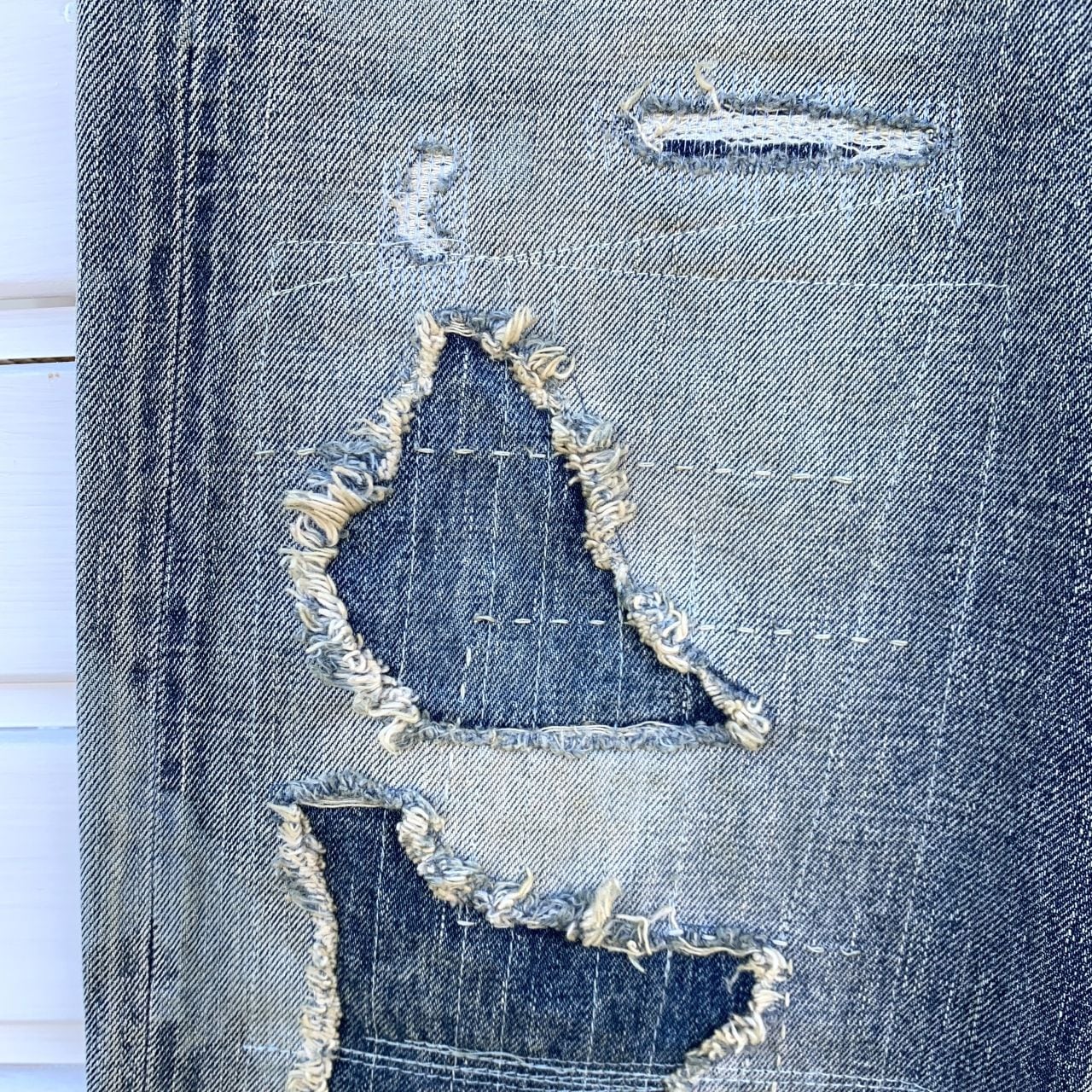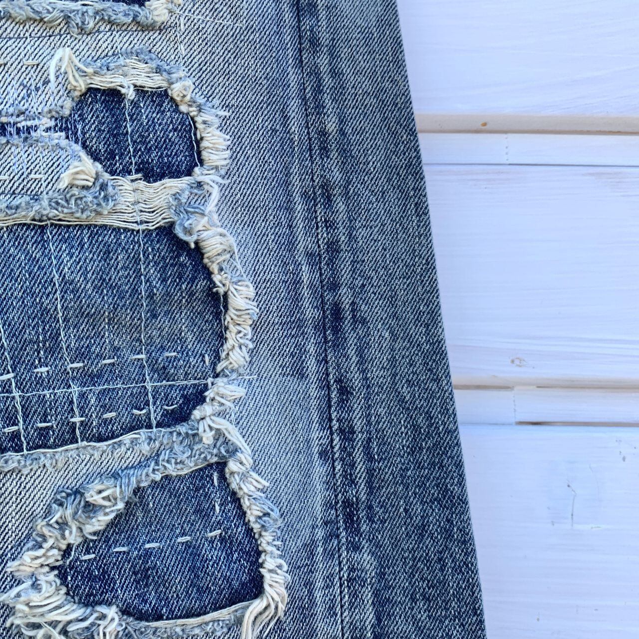 大きな穴が開いた部分には別のデニム生地を当てミシンで縦横に縫製されています。