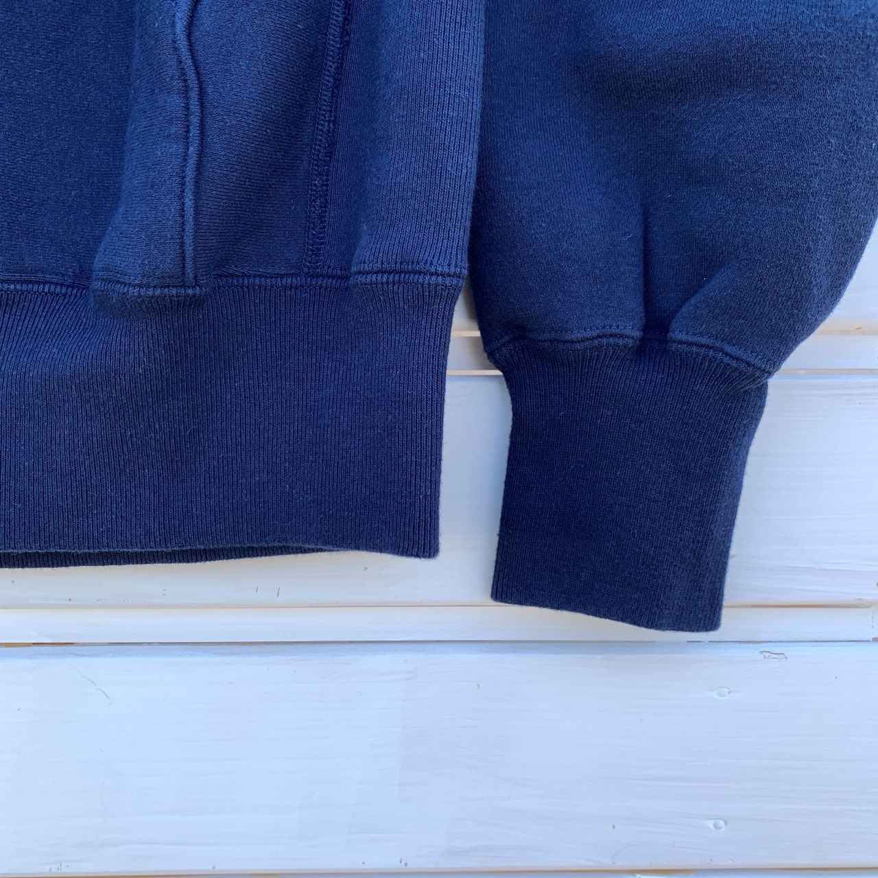 着丈の縮みを軽減するため生地を横方向に使用し、両脇をリブに切り替えて横方向に伸縮性をもたせたサイドパネル仕様のスウェットパーカー。