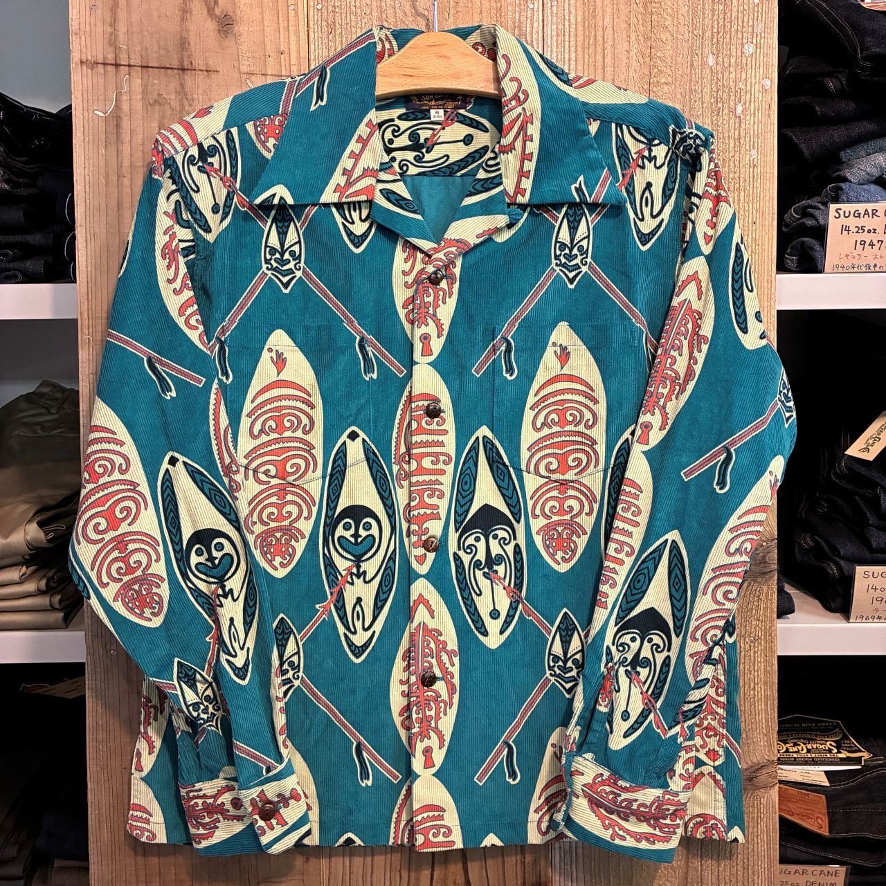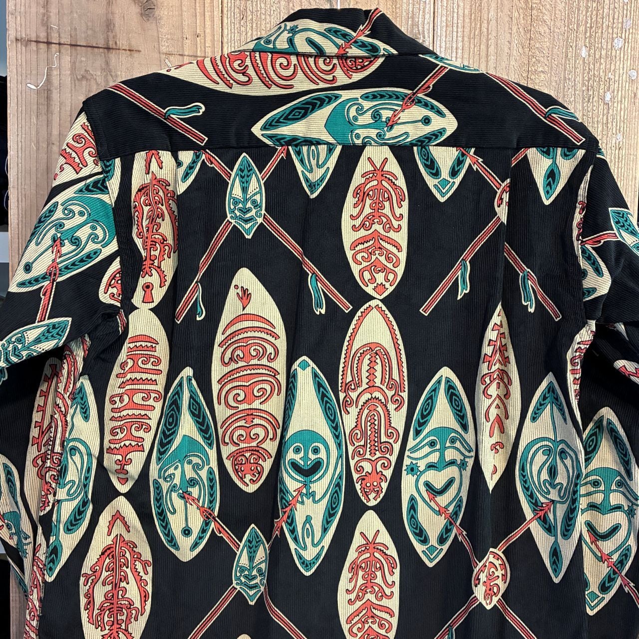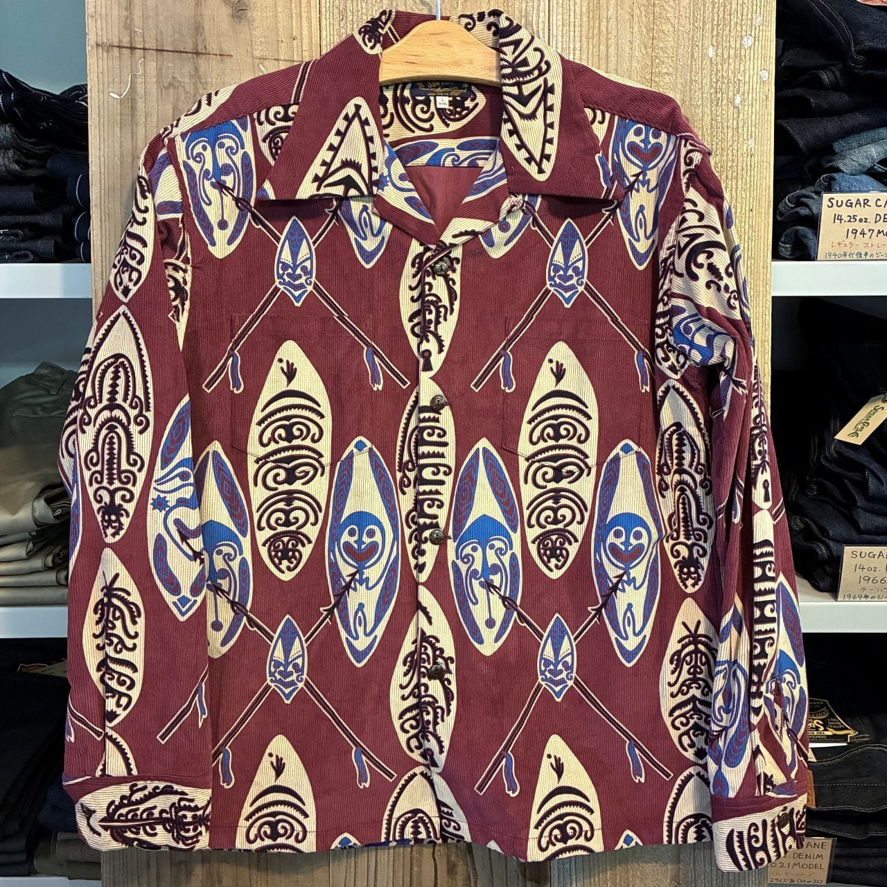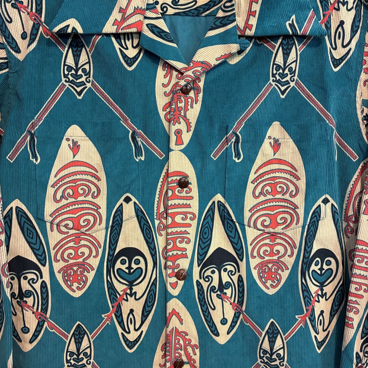 コーデュロイ生地にヴィンテージアロハシャツのプリントを施したロングスリーブ・オープンカラーシャツ。