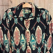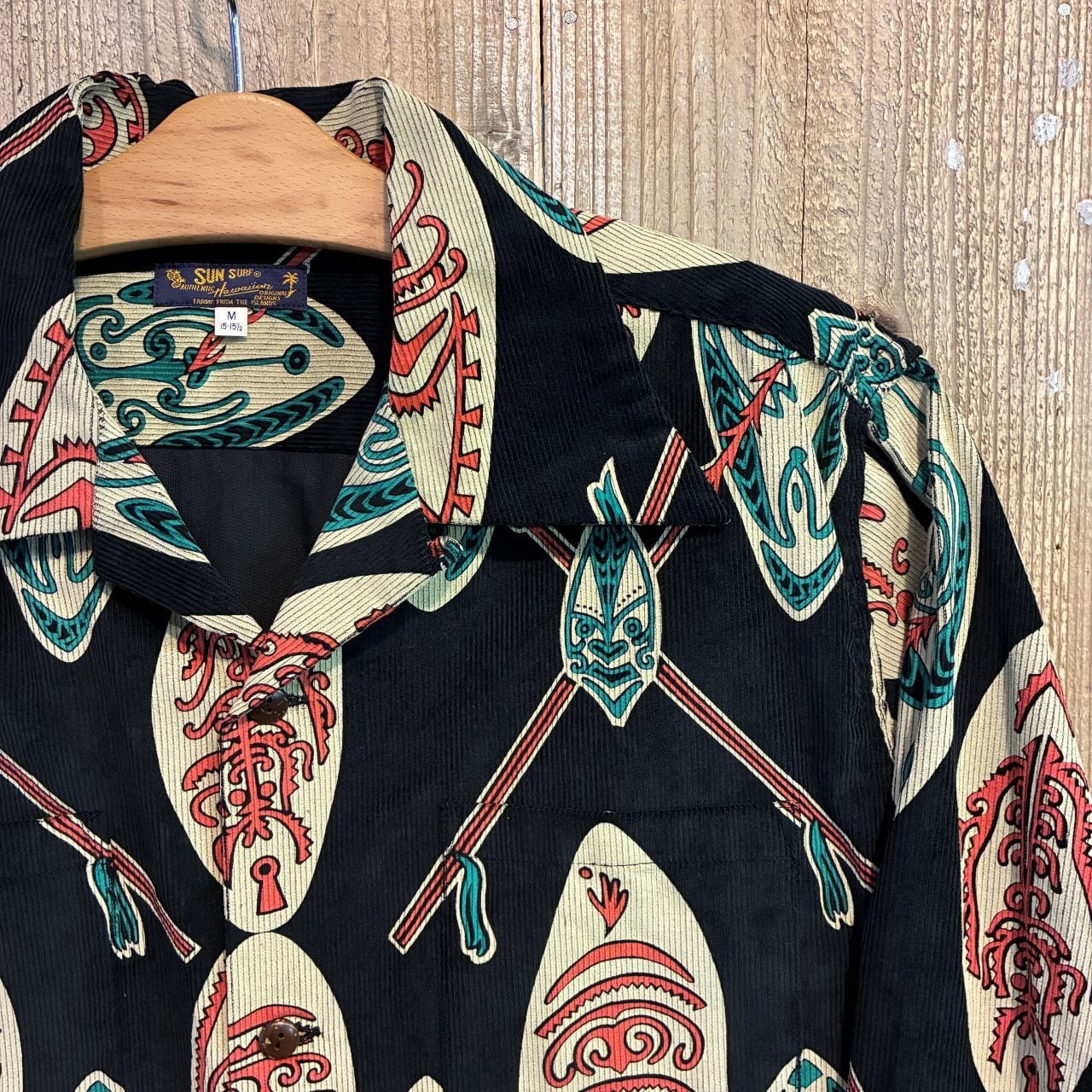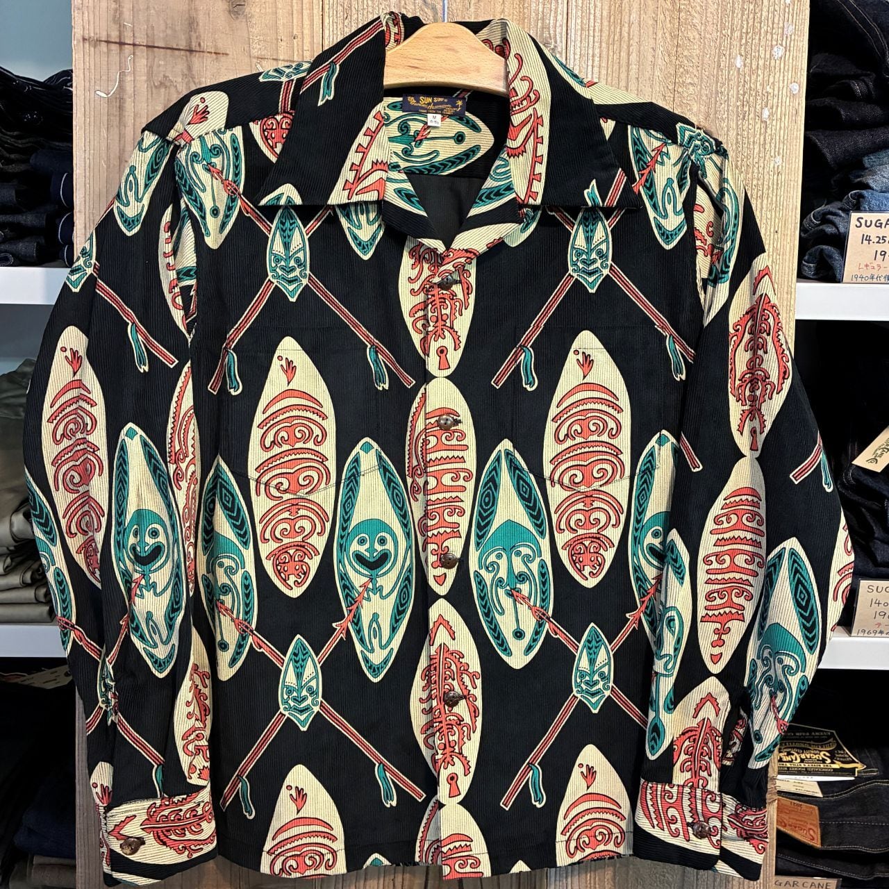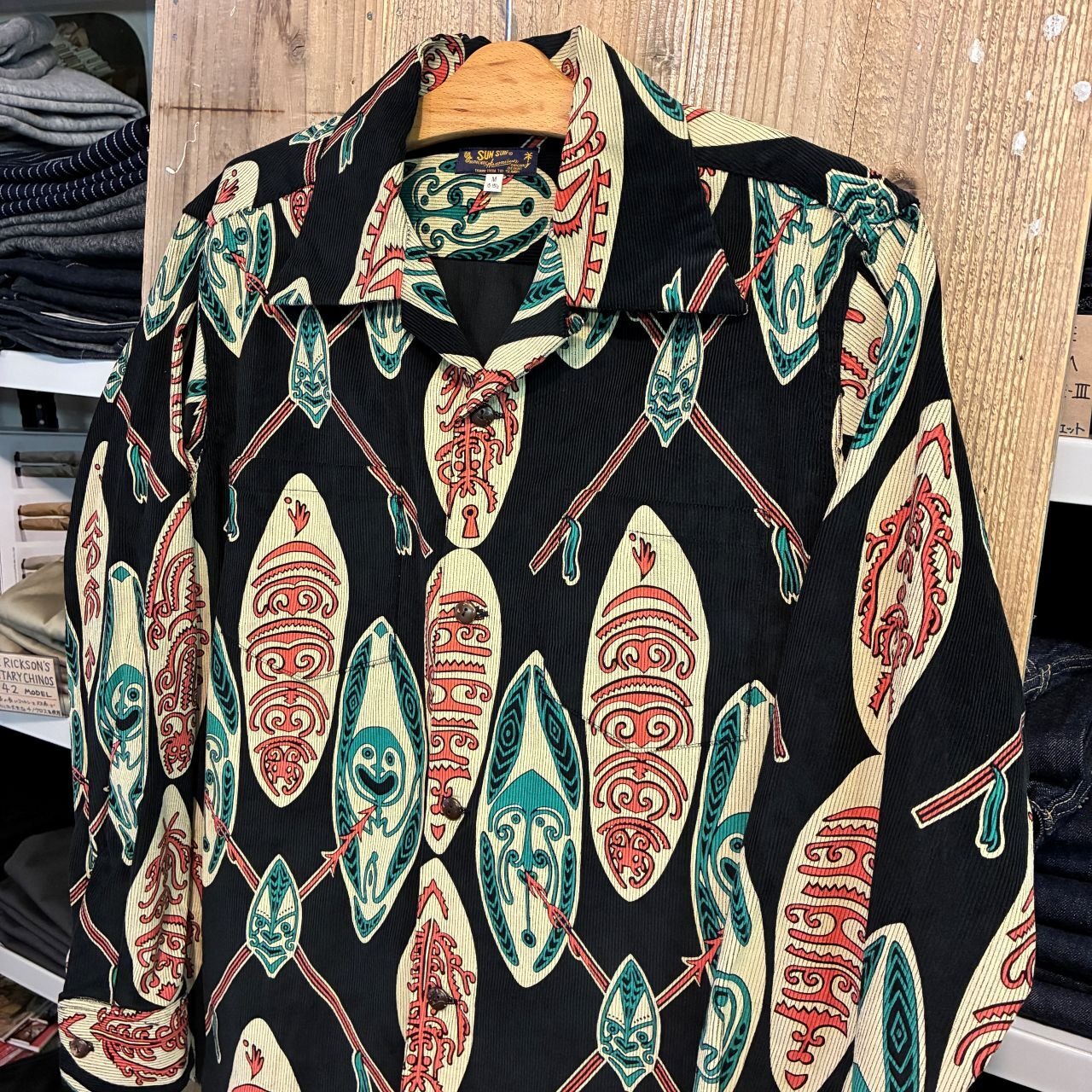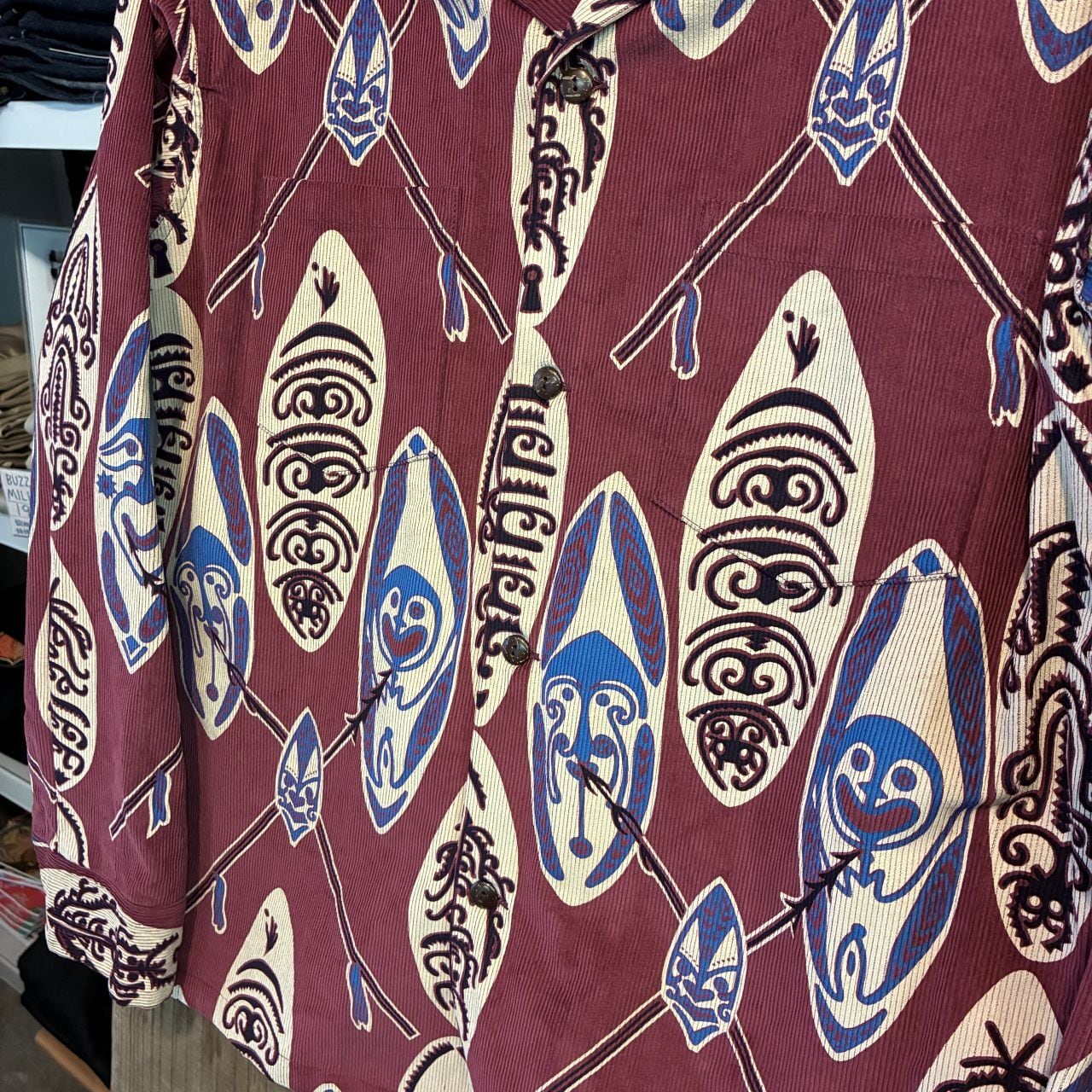 コーデュロイ生地にヴィンテージアロハシャツのプリントを施したロングスリーブ・オープンカラーシャツ。