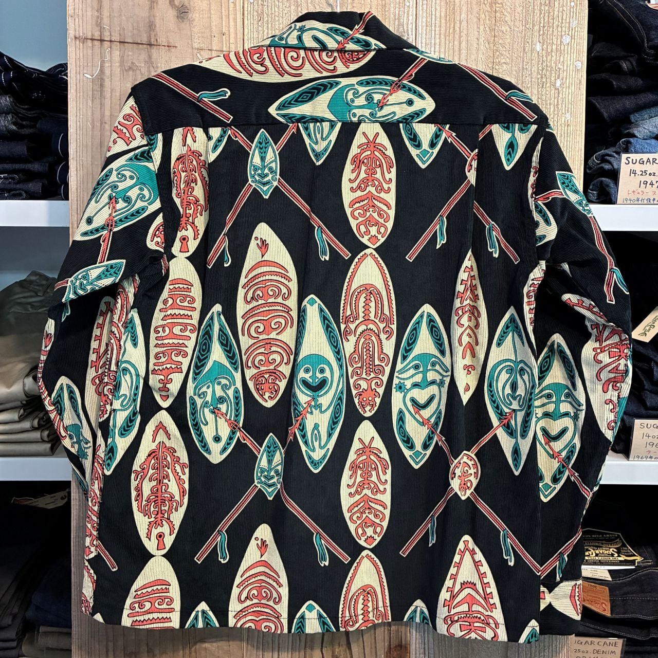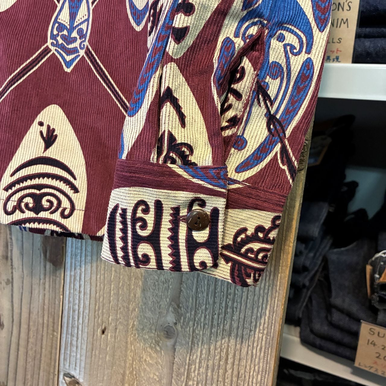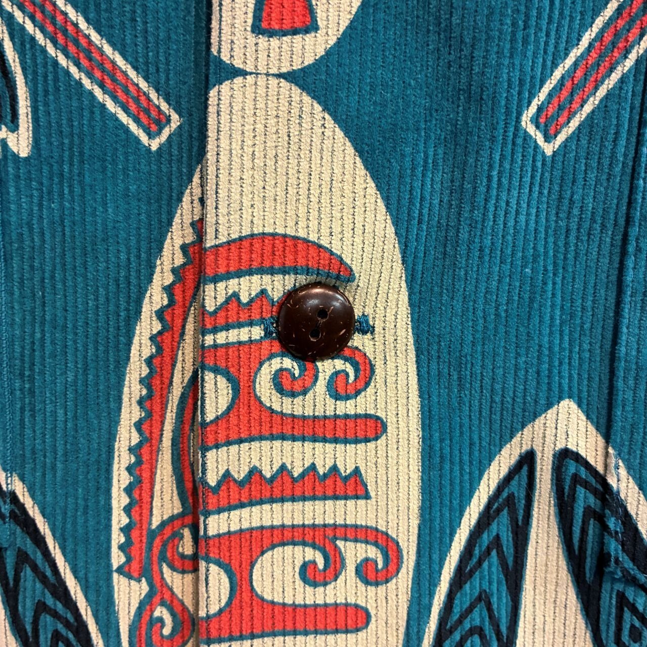 アロハシャツ同様に抜染プリント(地染めされた生地の柄の部分を抜染剤で色を抜いて他の色で染め付ける手法)されており、起毛し畝のあるコーデュロイの生地表面に色柄くっきりとプリントを施す高い技術力を感じます。