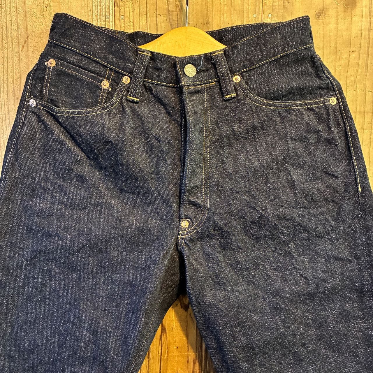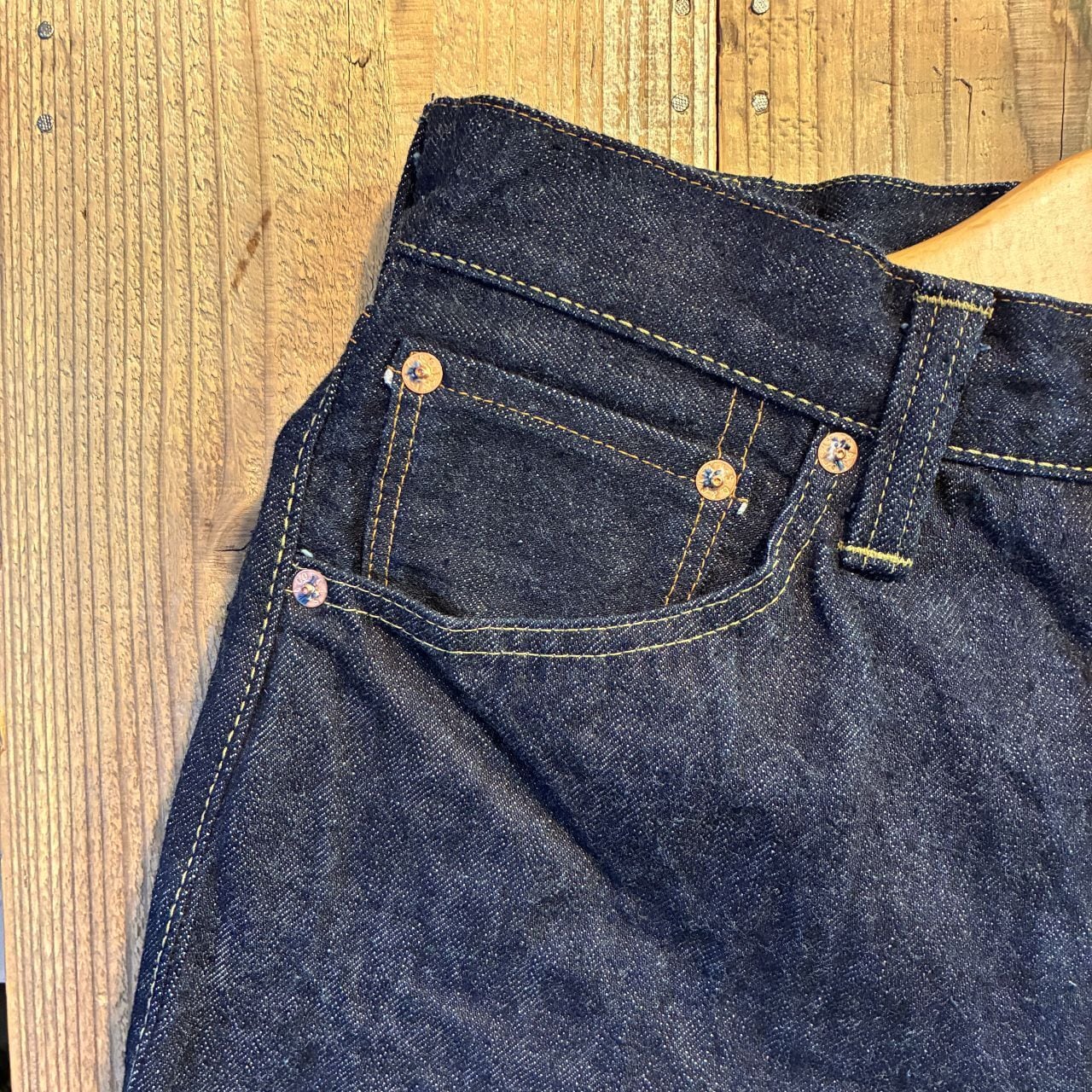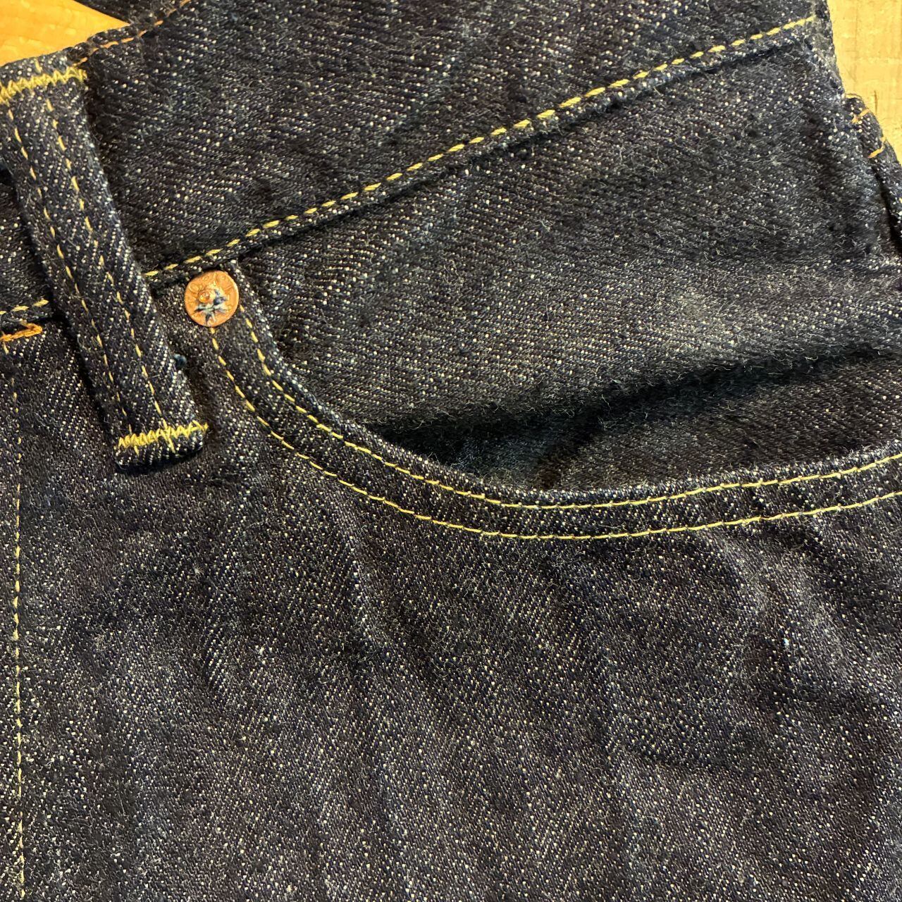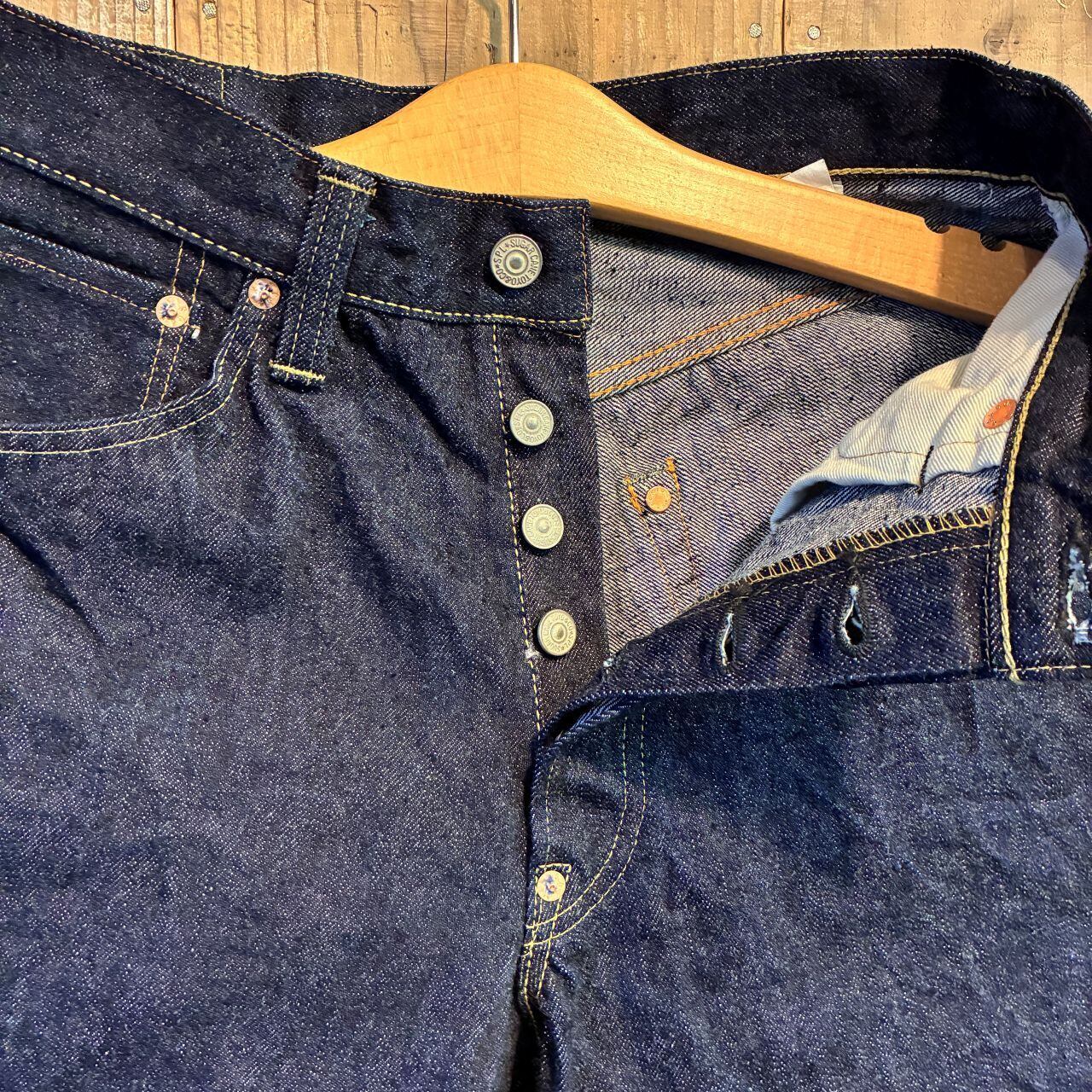 戦前の未熟な紡績を再現したムラ糸をタテ糸7番×ヨコ糸7番で製織したインディゴが濃くタテ糸のネップが目立つ13.5オンスのデニムを使用。