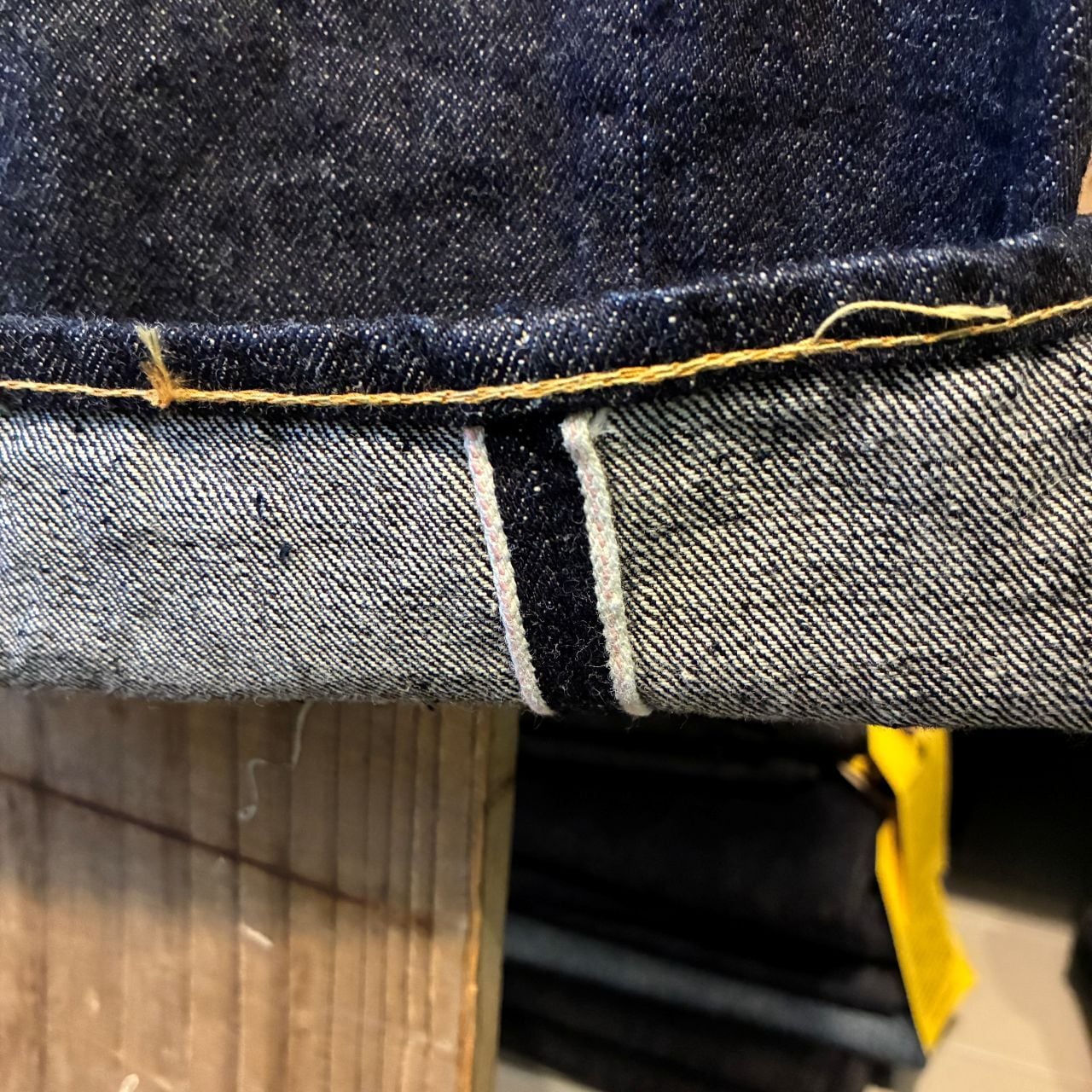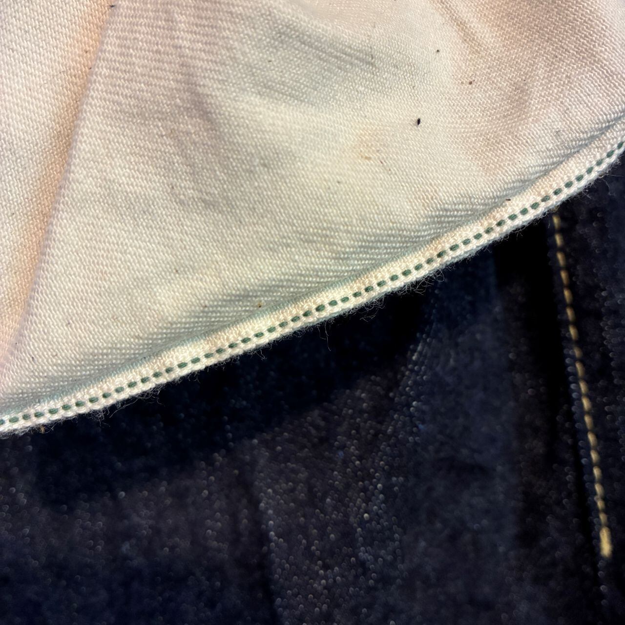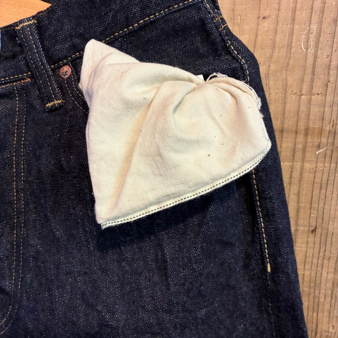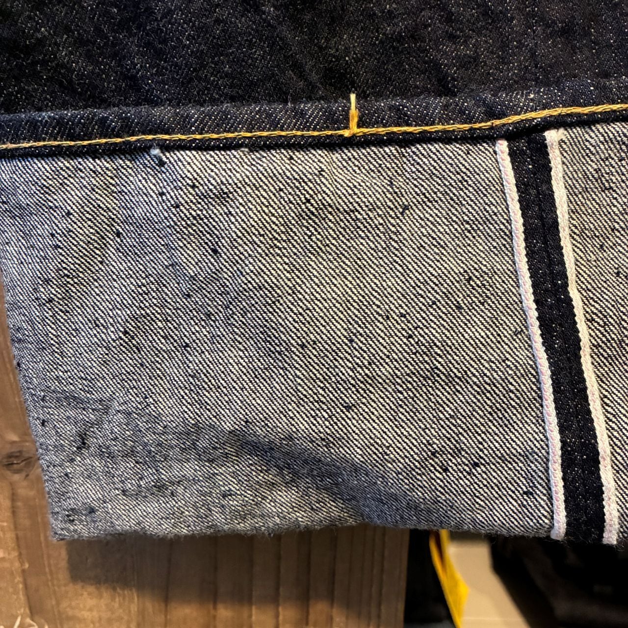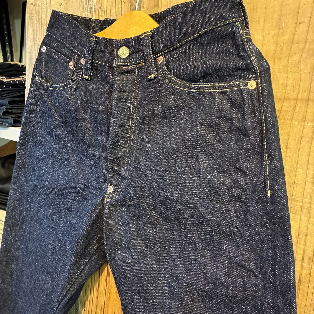 戦前の未熟な紡績を再現したムラ糸をタテ糸7番×ヨコ糸7番で製織したインディゴが濃くタテ糸のネップが目立つ13.5オンスのデニムを使用。