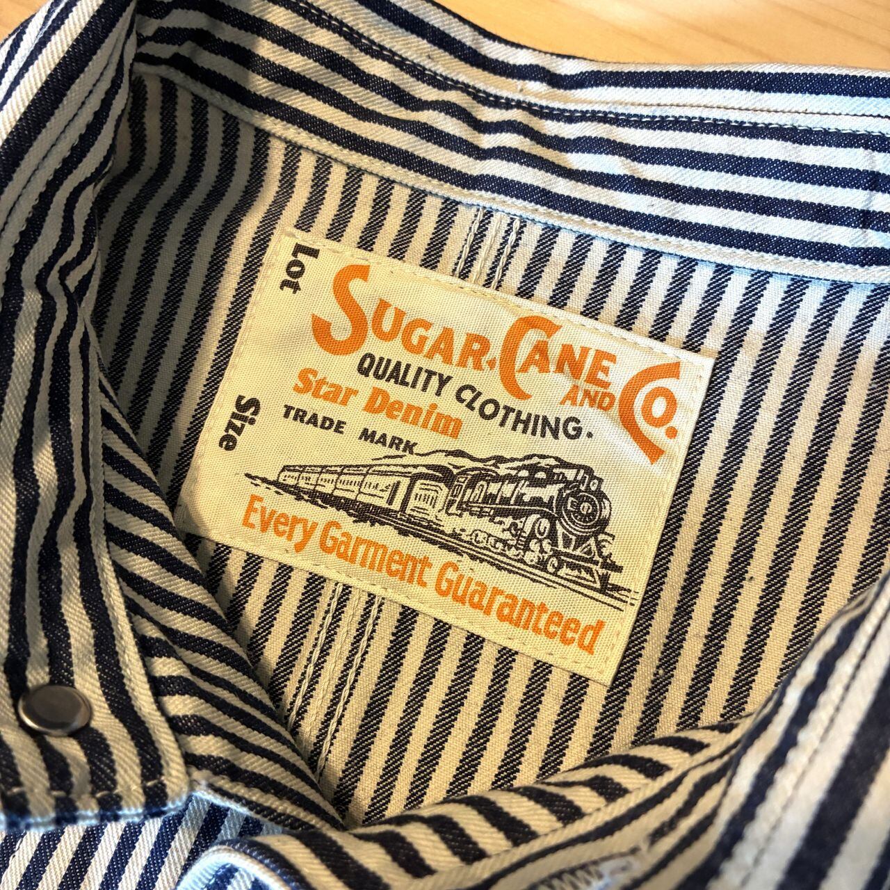 内側の襟下にはシュガーケーン・ブランドの布パッチが付き、左側の胸ポケットには機関車モチーフの織りネームとサイズタグが付きます。