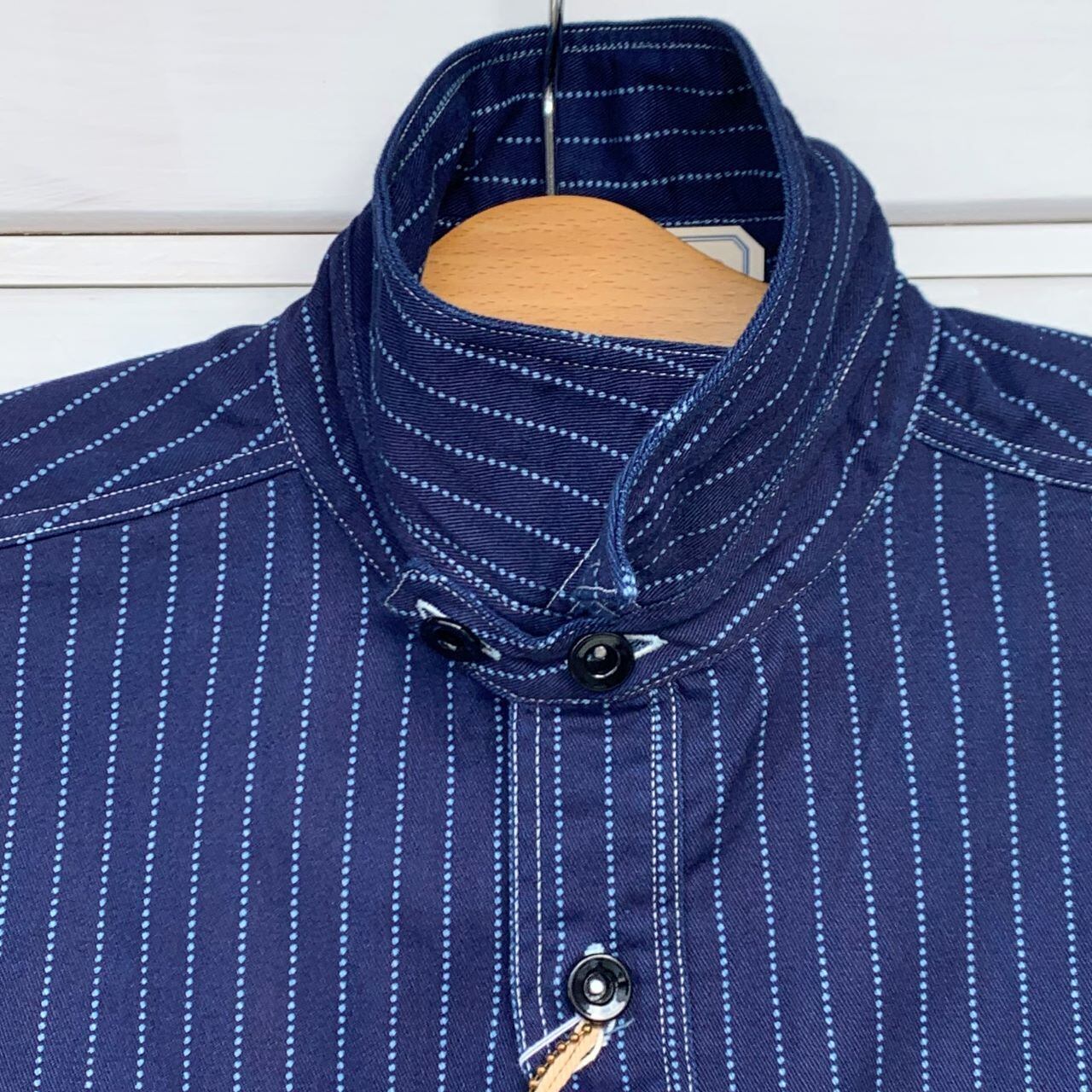チンストラップ、左右非対称のポケットや袖口のギャザー始末などのディティールを備えたワークウェア黎明期のデザインを基に、ヴィンテージでもレアなブラックウォバッシュストライプ生地を使用したシャツです。