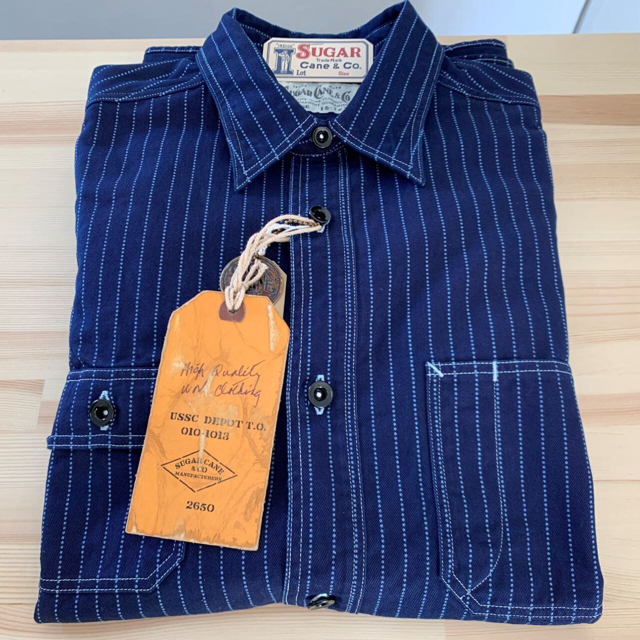 チンストラップ、左右非対称のポケットや袖口のギャザー始末などのディティールを備えたワークウェア黎明期のデザインを基に8.5オンスのインディゴウォバッシュストライプ生地を使用したシャツです。