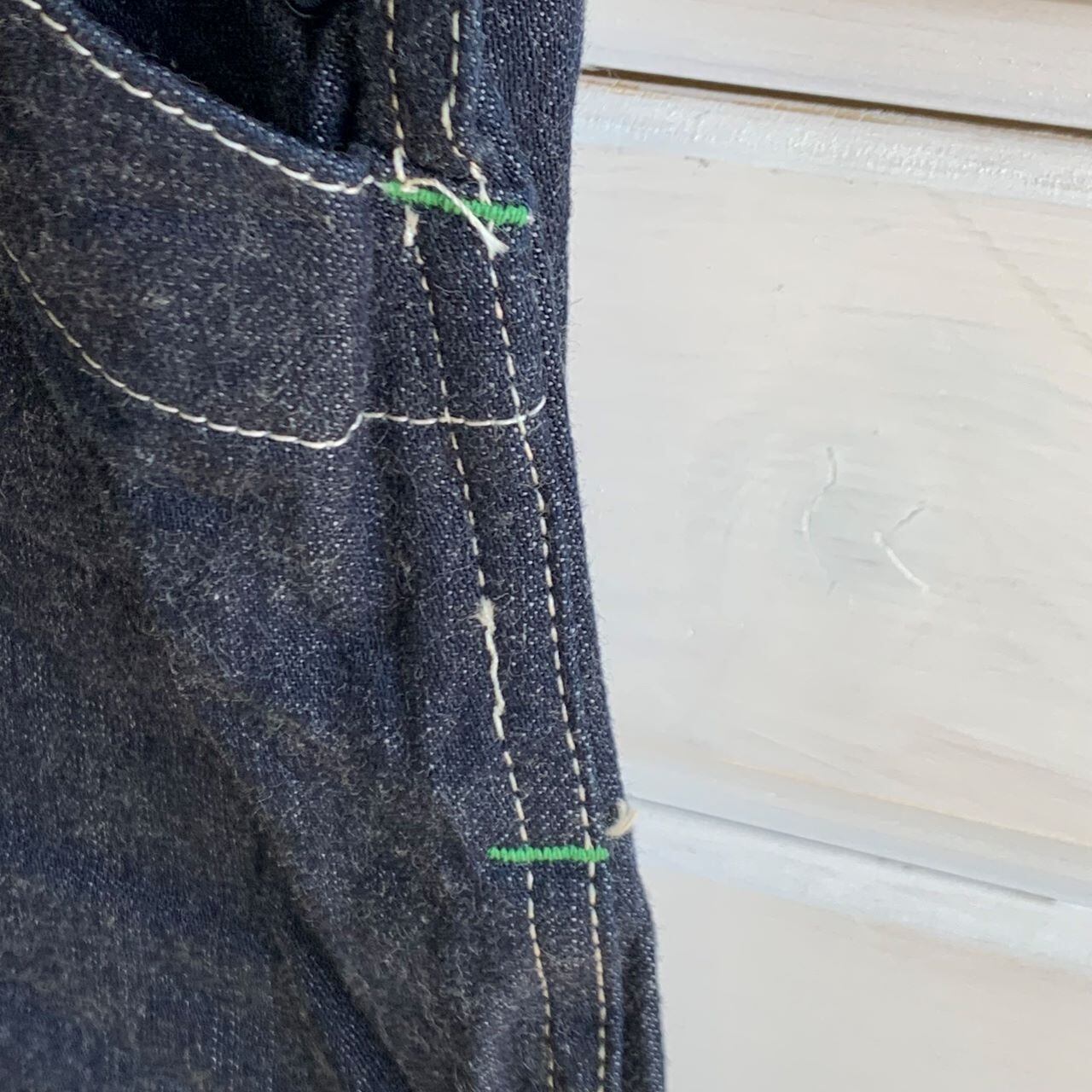 大部分の縫製糸は白色ですが、ポケット周りのカンヌキ部分には緑色の糸が使用されております。