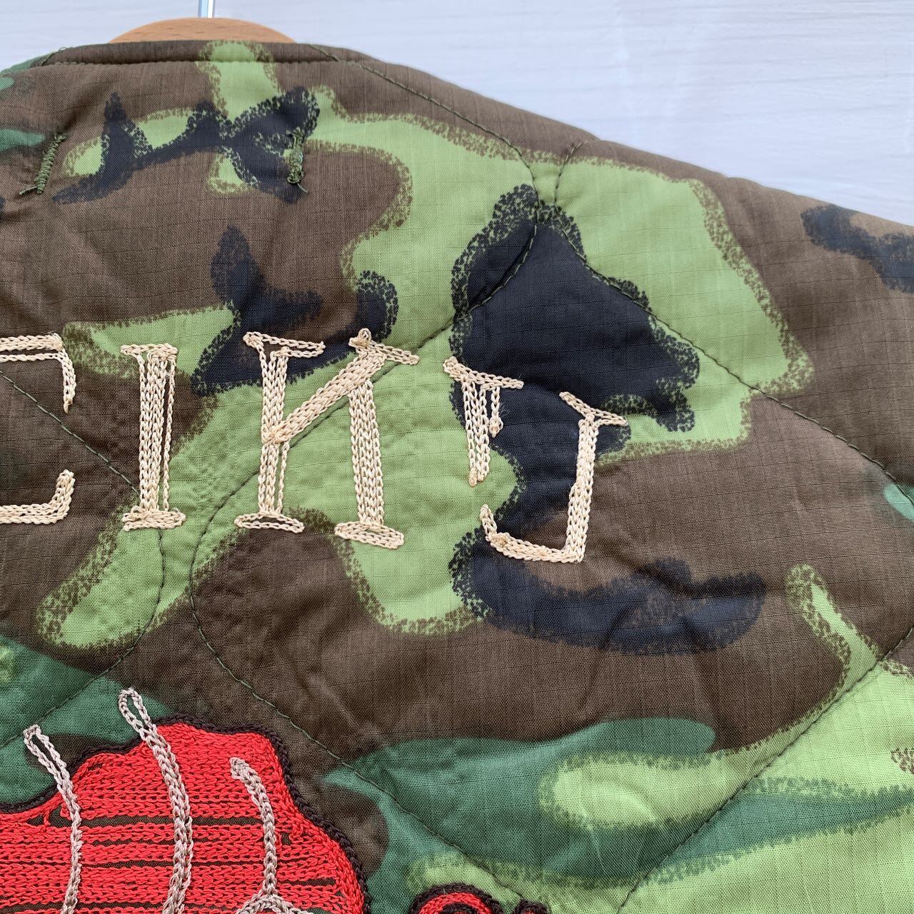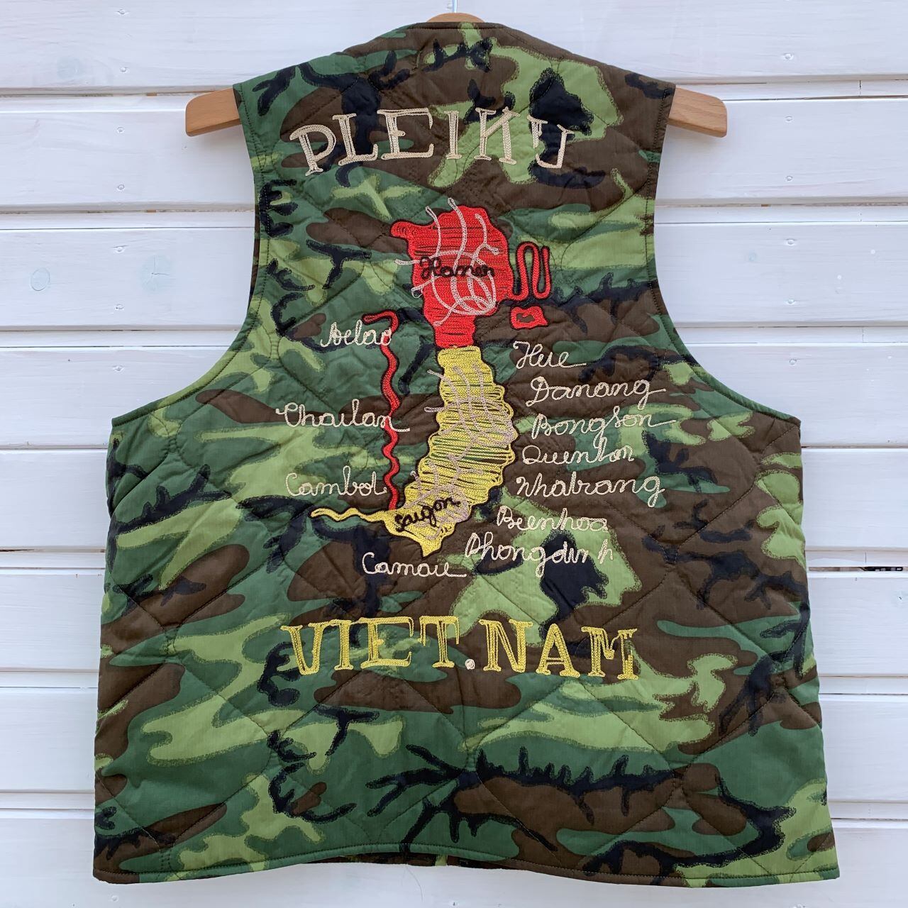 1960年代後期にベトナムの都市 PLEIKU(プレイク)に駐留していた米兵がカスタムオーダーで仕立てたスーベニアベスト。フロントには刺繍が無く、背中にだけ刺繍が入るモデル。ベトジャンの刺繍はマットな太めの色糸が一般的だが、このように光沢のあるレーヨン糸でチェーン刺繍が施されたものは大変希少である。所々、刺繍が削れた部分があるのもベースにしたヴィンテージに準じた作り。