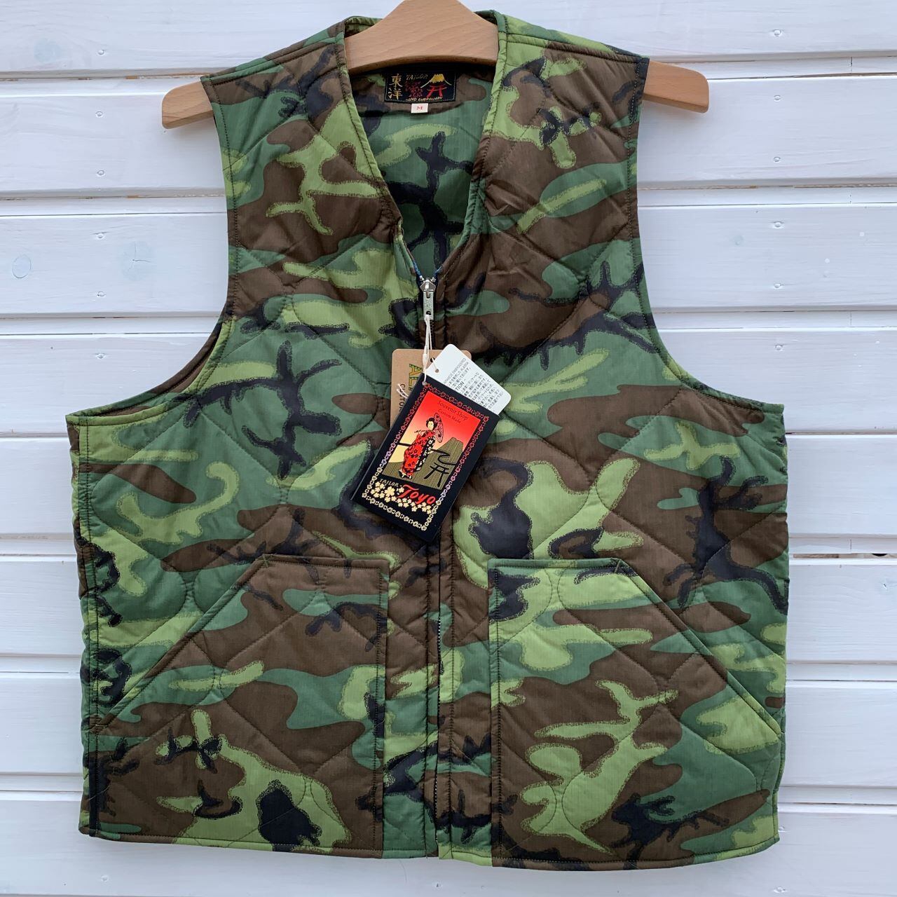 テイラー東洋よりカモフラージュ柄ナイロン製リップストップ生地を使用した中綿入りキルティングベストです。